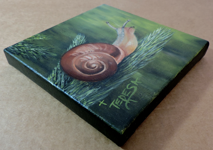 “Snail #3: Out on a Limb” captures the quiet charm and natural detail that define the collection. Shaped by Teresa’s signature realistic style, this piece offers a moment of stillness and observation. Its compact size makes it ideal for intimate spaces, while its brushwork and originality make it a lasting addition to any collection. A thoughtful choice for nature lovers, outdoor enthusiasts, or anyone drawn to the quiet intricacies of gastropods—whether by curiosity, study, or affection.